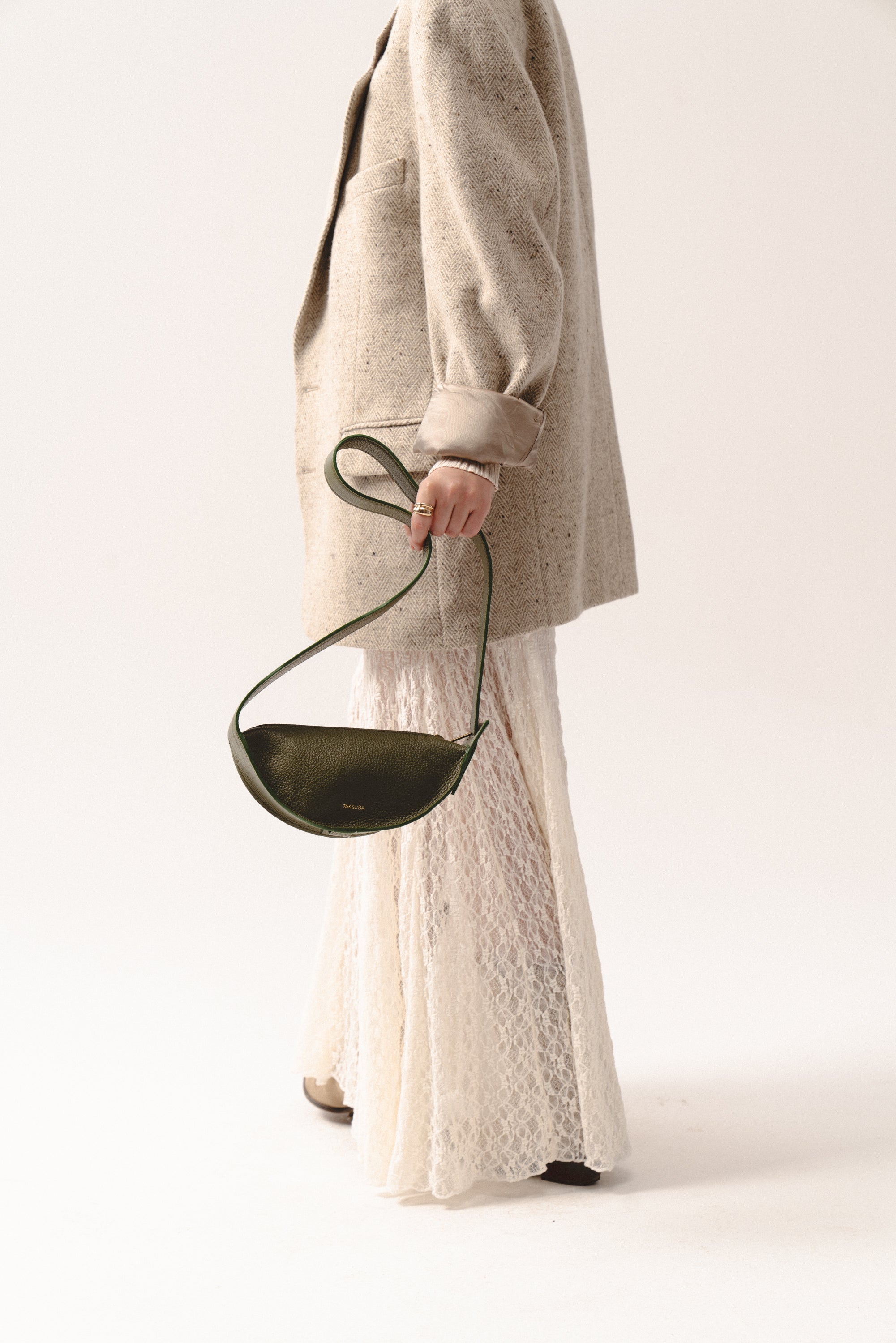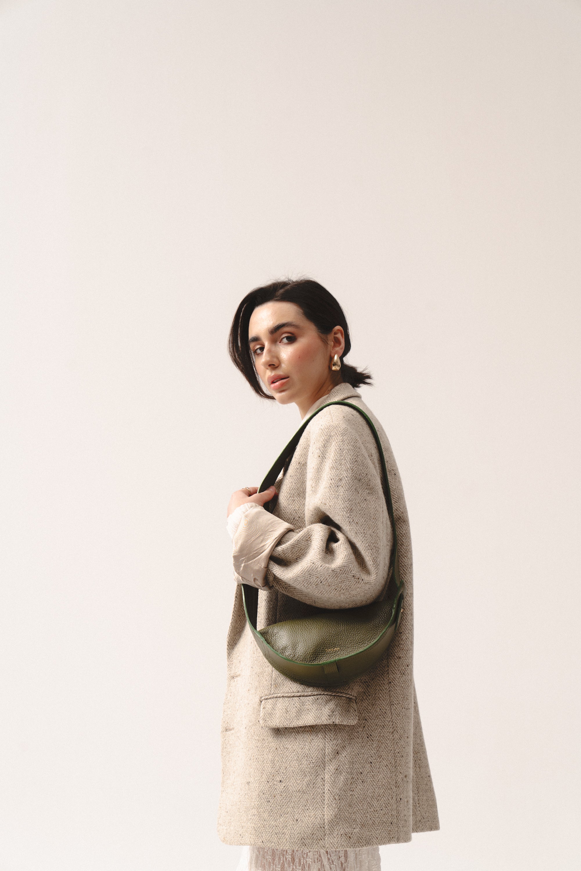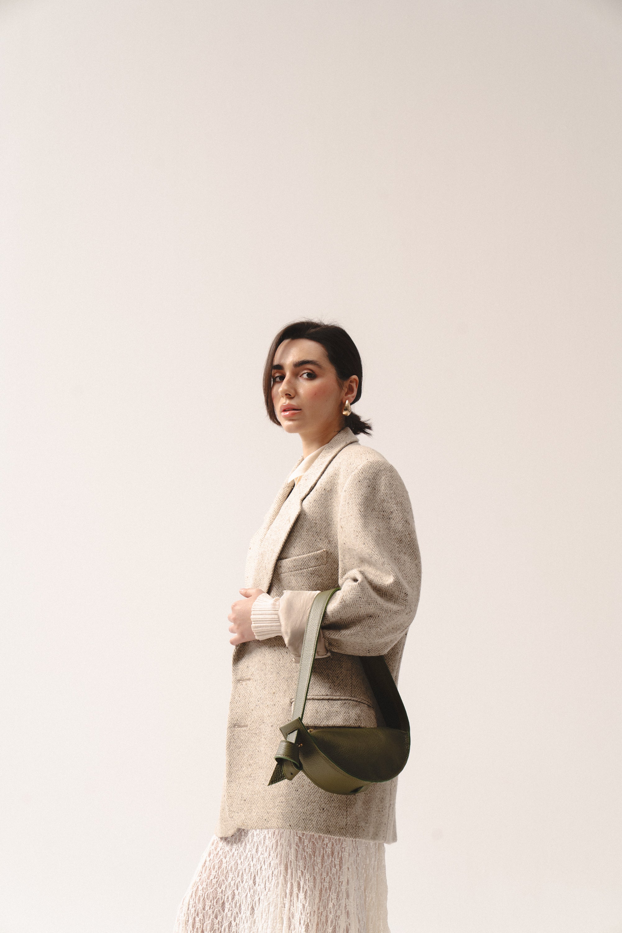 Skórzana Torebka Eclipse ma unikalny kształt inspirowany księżycem, łącząc nowoczesny minimalizm z ponadczasową elegancją.